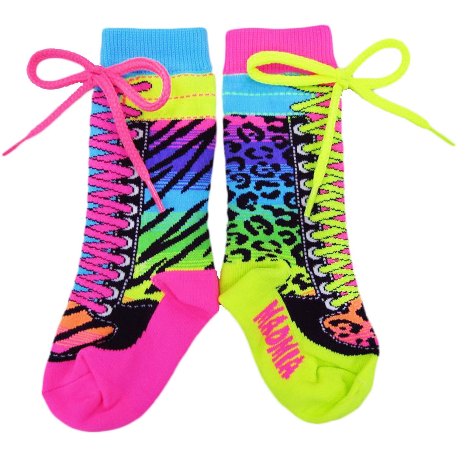 MADMIA Safari Socks are a mix and match pair, with a leopard and zebra print to truly embrace an endless safari adventure. Complete with shoelace print and shoe lace topper of pink and yellow.