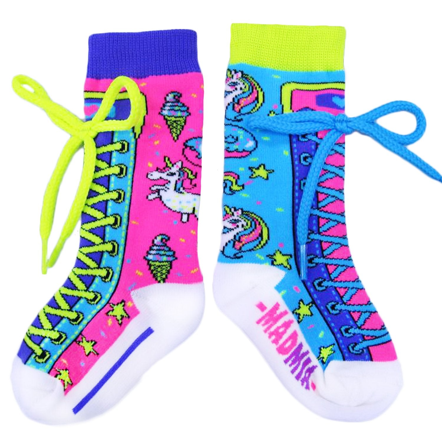 MADMIA Unicorn Socks are a mix and match pair of blue and pink, with a unicorn print, and the perfect mix of sweets with donuts and ice-cream, and a dazzle of stars. Complete with shoelace print and shoe lace topper of yellow and blue.